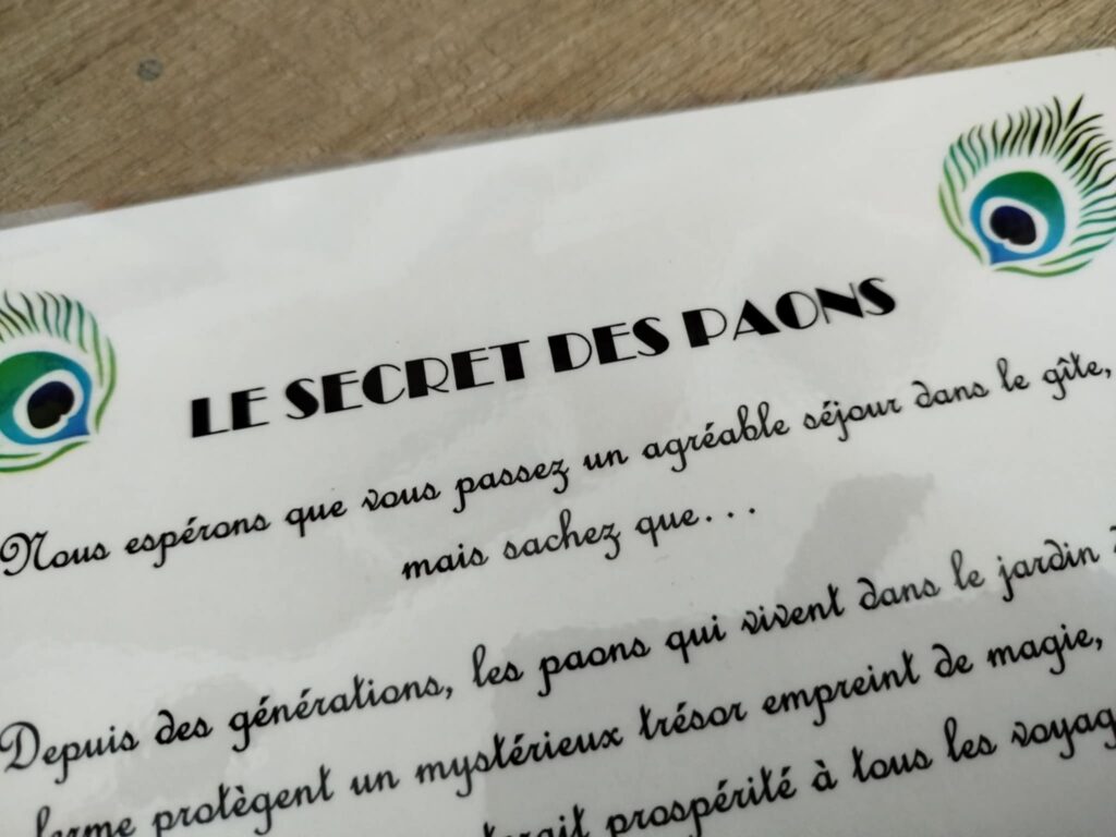 A votre arrivée, vous découvrirez une lettre. Un secret plane sur la ferme, bien gardé par les paons… Saurez-vous résoudre les différentes énigmes disséminées dans le gîte afin de mettre la main sur le trésor ??